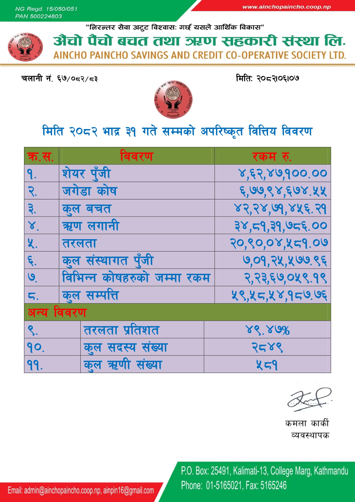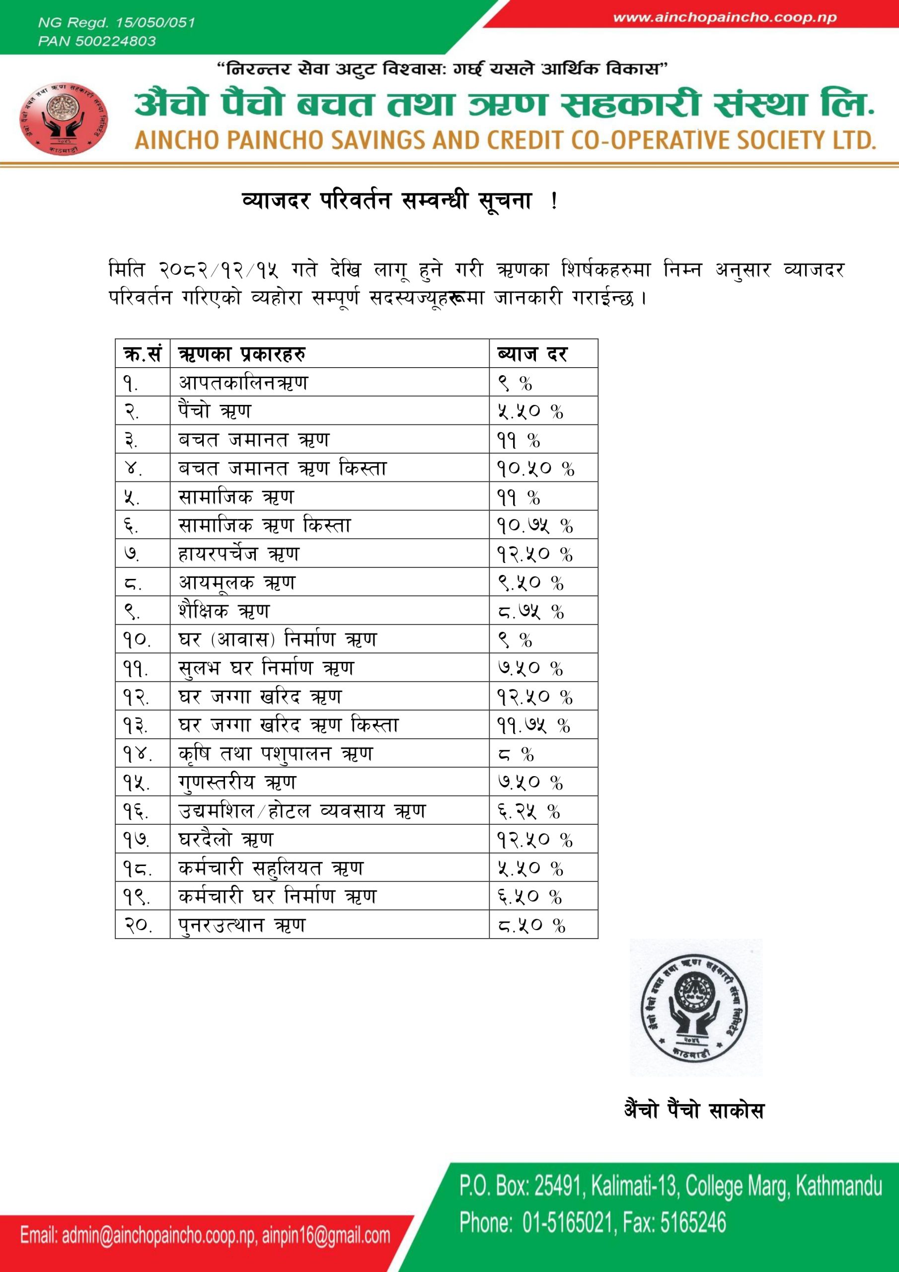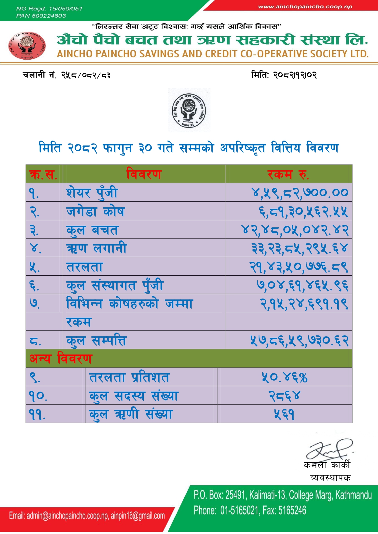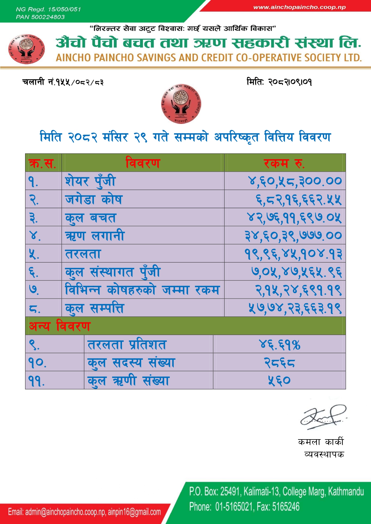 सहकारी ऐन, २०४८ जारी भएपछि यस संस्थाले काठमाडौं उपत्यका भित्र कार्यक्षेत्र रहने गरी अैंचो पैंचो बचत तथा ऋण सहकारी संस्था लि। को रुपमा २०५०।०४।०८ मा सहकारी ऐन अनुसार दर्ता भई कानुनी मान्यता प्राप्त गरेको छ र मिति २०५५।०८।०४ मा सहकारी विभागबाट नेपाल भरी आफ्नो कार्यक्षत्र रहने गरी स्विकृत प्राप्त गरेका छ । हाल यस संस्थाले कालिमाटी स्थित आफ्नै भवन बाट सदस्यहरु लाई सेवा प्रदान गर्दे आएको छ । सहकारी मुल्य र मान्यतामा संचालित सहकारी क्षेत्रमानै समर्पित यस संस्थालाई नेपाल सरकार डिभिजन सहकारी कार्यालयले २०६३ सालमा काठमाडौं जिल्लाको उत्कृष्ट सहकारीको रुपमा पुरस्कृत गरेको थियो भने आर्थिक वर्ष २०६९/०७० मा सहकारी तर्फ उच्चतम कर सहभागीता जनाए बापत तेस्रो सहकारी कर दिवस २०७१ मा करदाता सेवा कार्यालय कालिमाटीले सम्मान पत्र प्रदान गरेको थियो ।